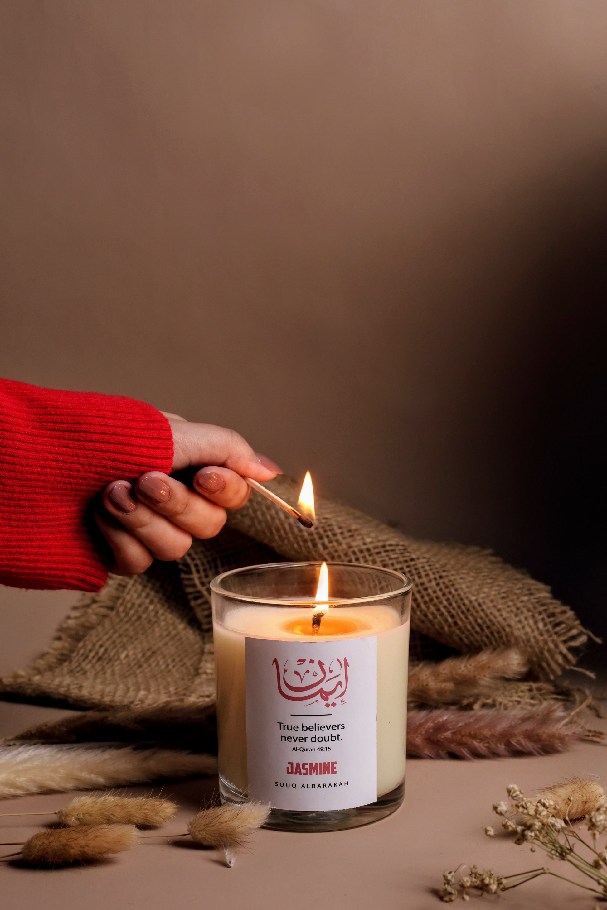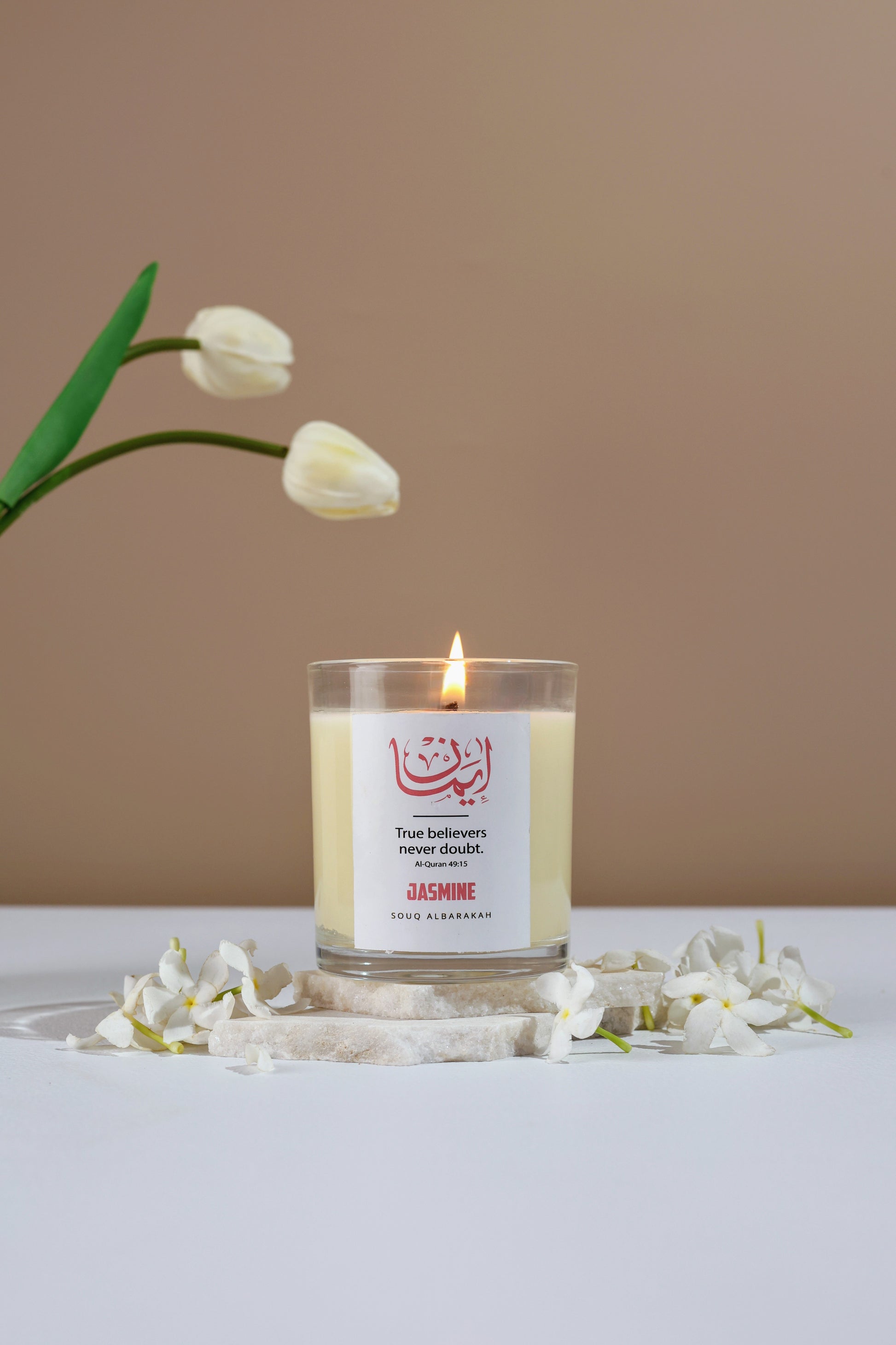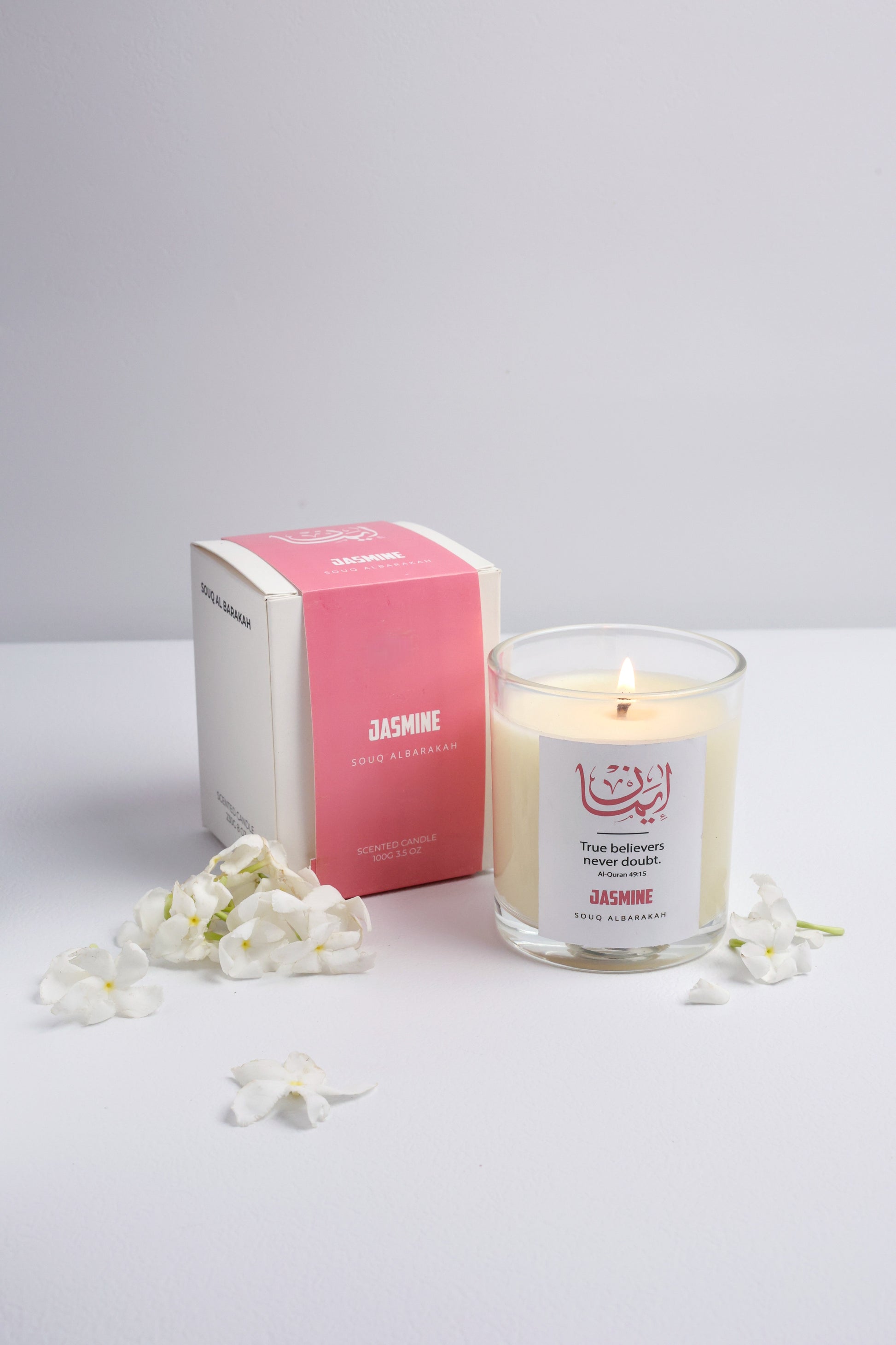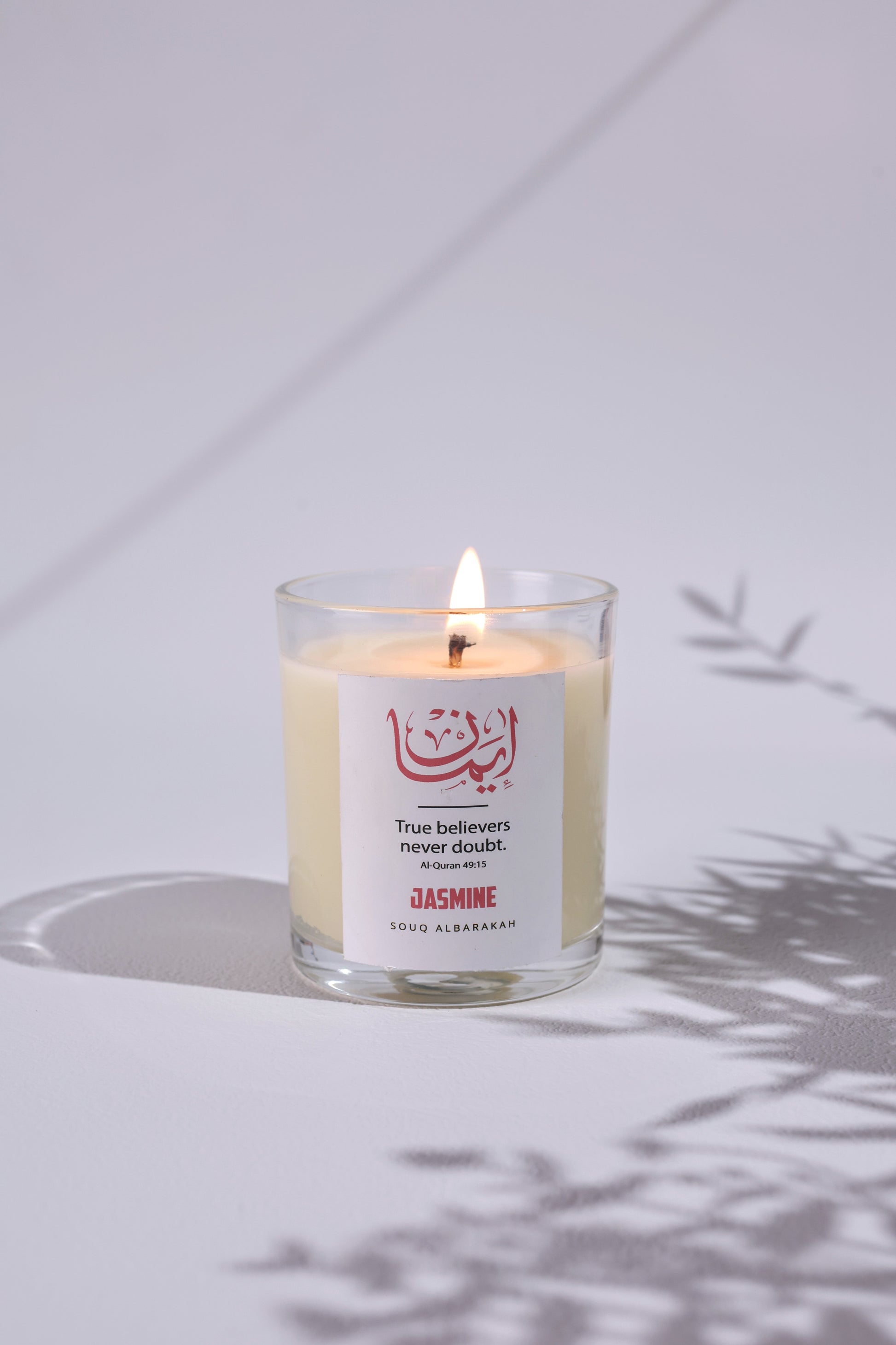 Emaan – Jasmine Candle is a hand-poured soy wax candle infused with premium jasmine oils, symbolizing faith (Emaan) — the light that guides in ease and hardship. Its refreshing fragrance creates a serene atmosphere for prayer, Qur’an recitation, or reflection. With elegant Islamic calligraphy design, it’s both a source of tranquility and a meaningful gift for Ramadan, Eid, weddings, or personal moments of peace.