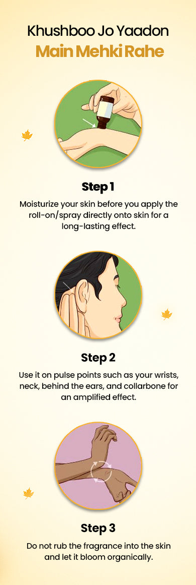For best results, first moisturize your skin, then apply a small drop of attar on your pulse points — wrists, behind the ears, and neck.