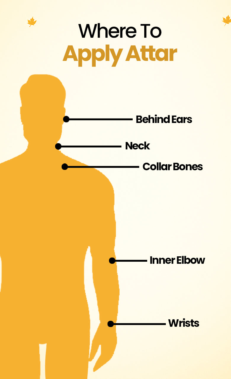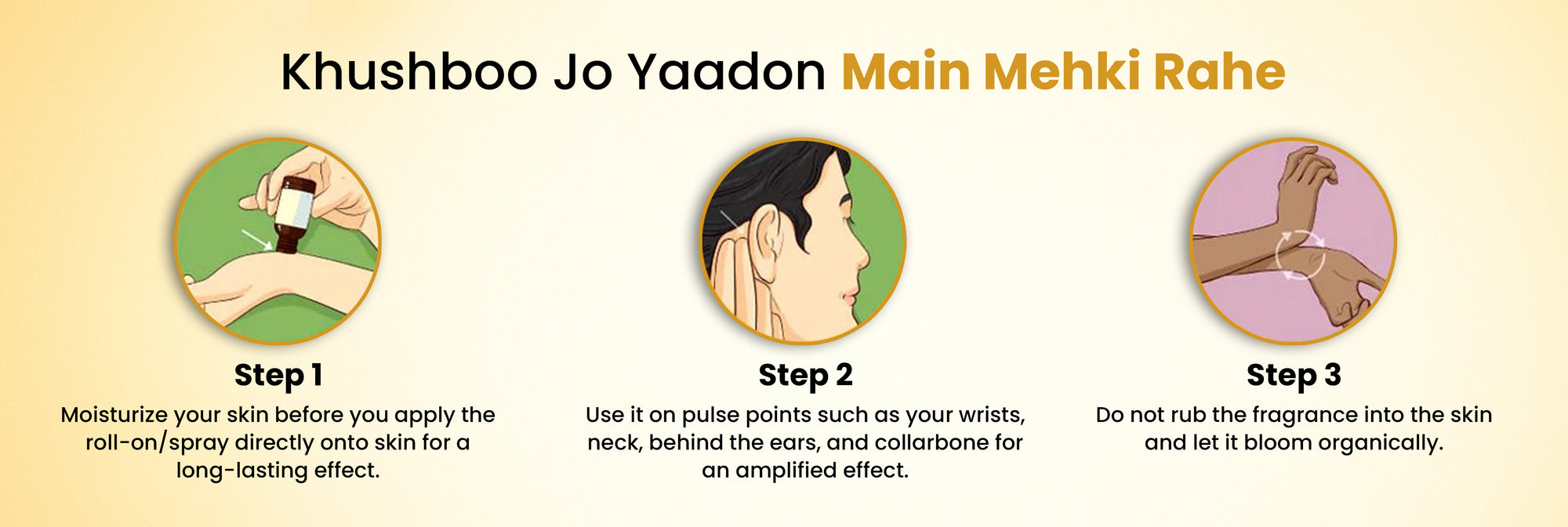 For best results, first moisturize your skin, then apply a small drop of attar on your pulse points — wrists, behind the ears, and neck.