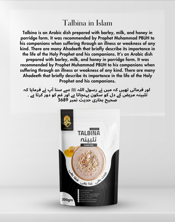 Talbina is a traditional Arabic dish made from barley, milk, and honey, served as a porridge. Prophet Muhammad (PBUH) recommended it to his companions during times of illness or weakness, and various Ahadeeth highlight its significance in his life and that of his companions.